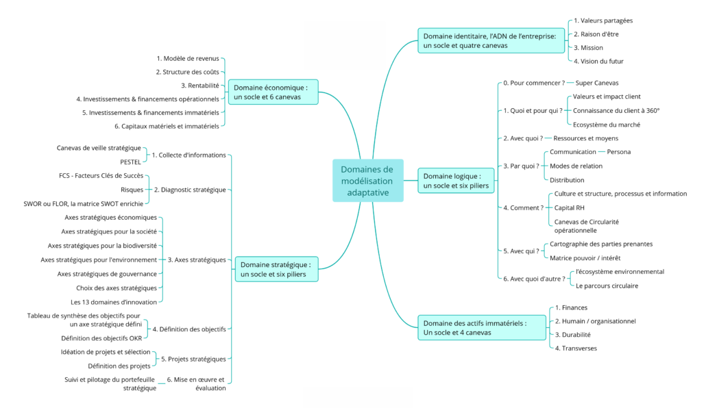 Pour combler ce manque, un écosystème de canevas interconnectés a été conçu. Il couvre cinq domaines — identitaire, logique, stratégique, immatériel et financier — à travers une cinquentaine de canevas, hébergés sur une plateforme SaaS sécurisée.